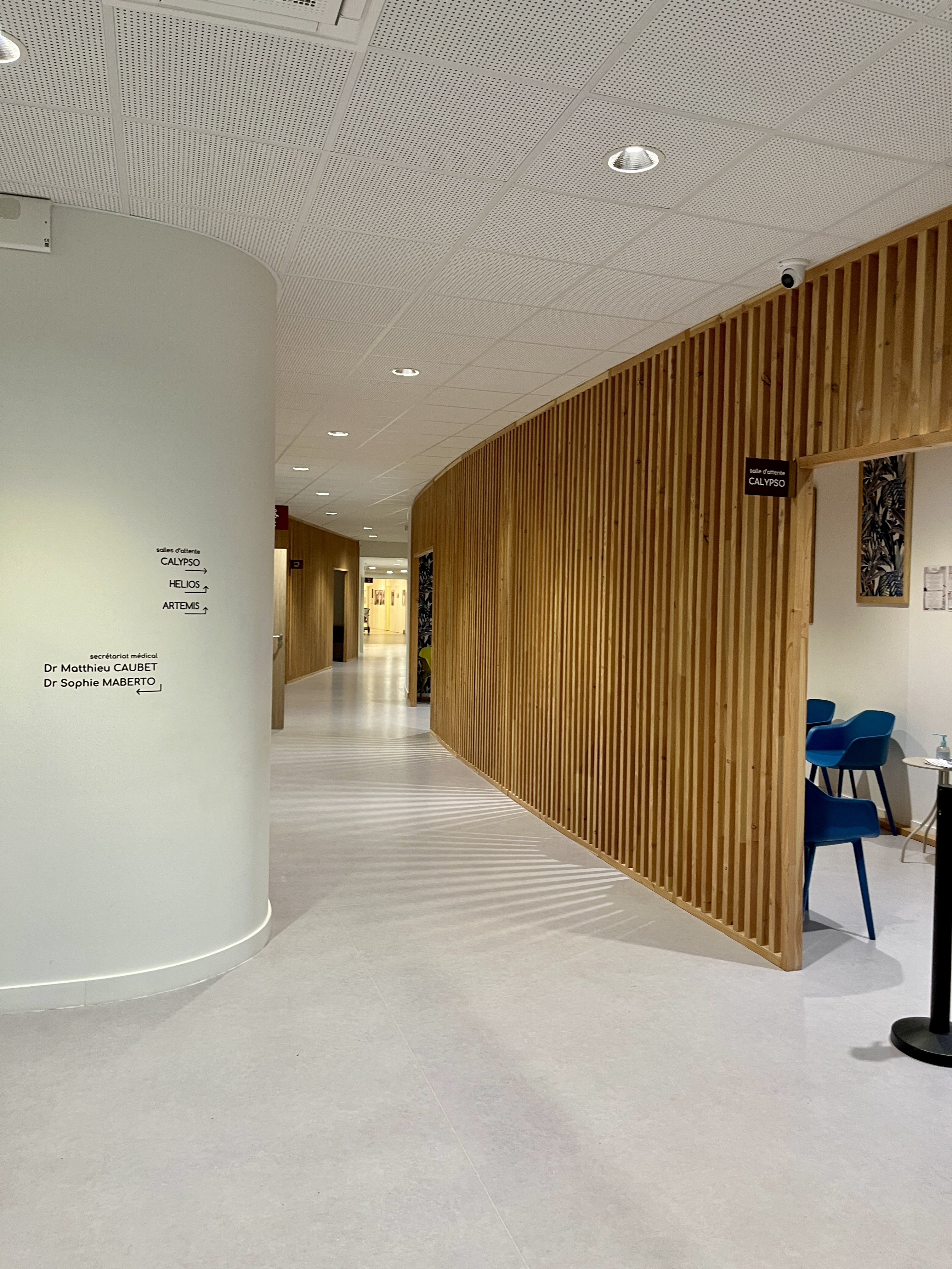 La zone d’accueil est facilement visible et accessible. Les espaces d’attente sont traités de manière plus intimiste à l’aide de claustra bois. Une déambulation généreuse permettra un confort de déplacement aux différents usagers du lieu.