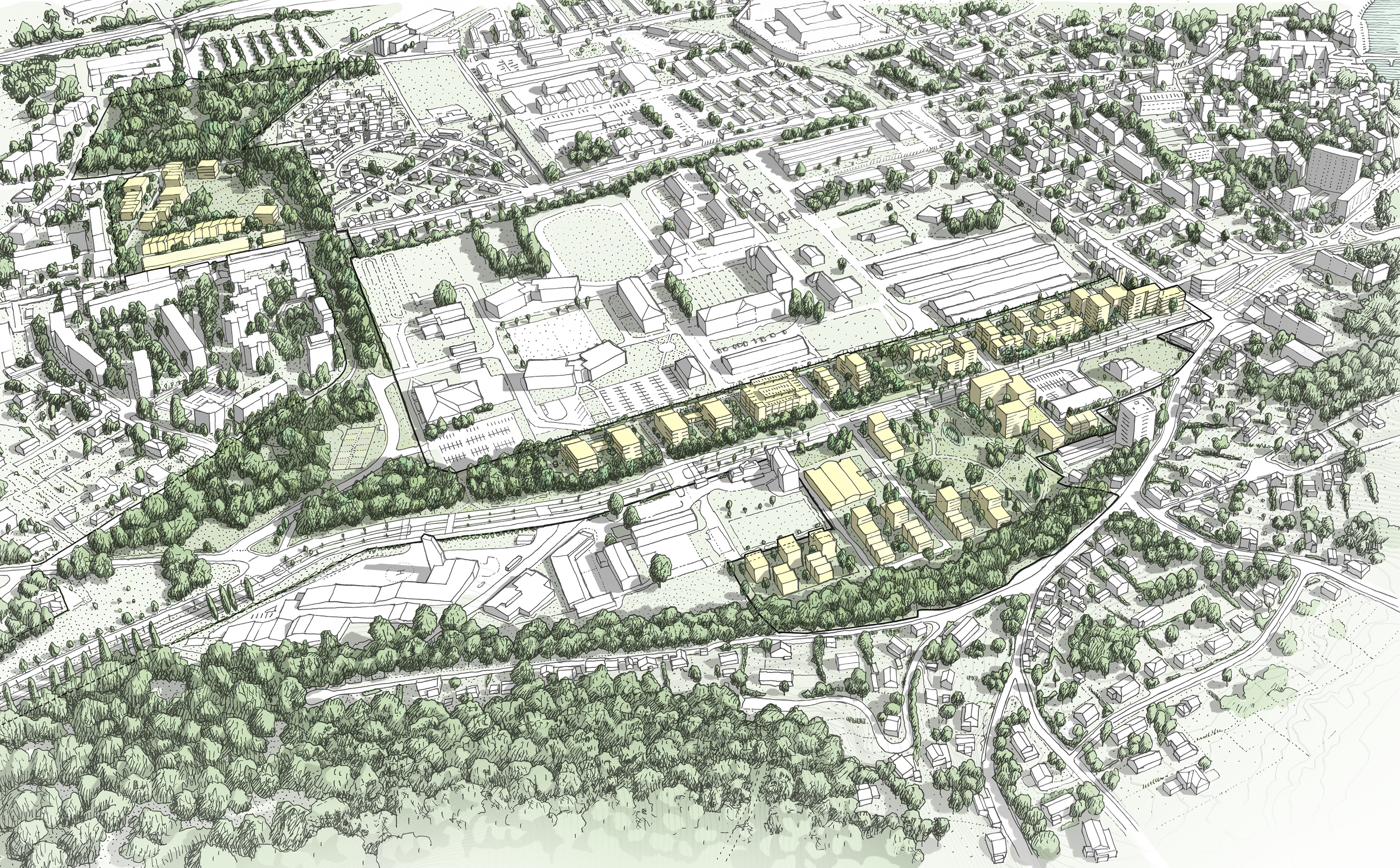 Vue aérienne des 3 secteurs, au pied de la colline de Rosemont. Illustration @EXP architectes
