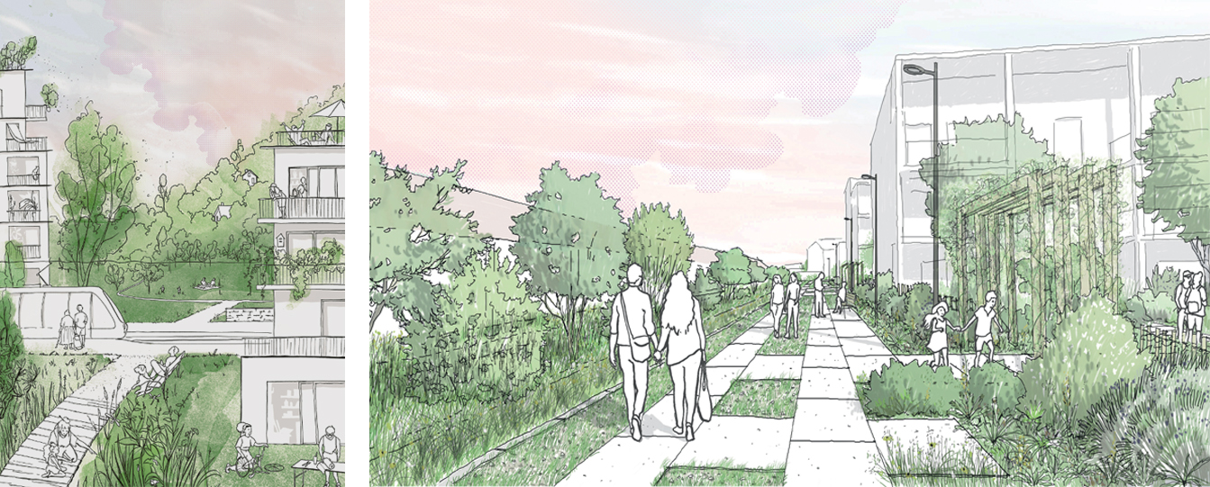 Croquis d’ambiance du secteur BRULARD, Un habitat « Ville-Nature ». Illustration @STUDIO MUSTARD et @MOABI